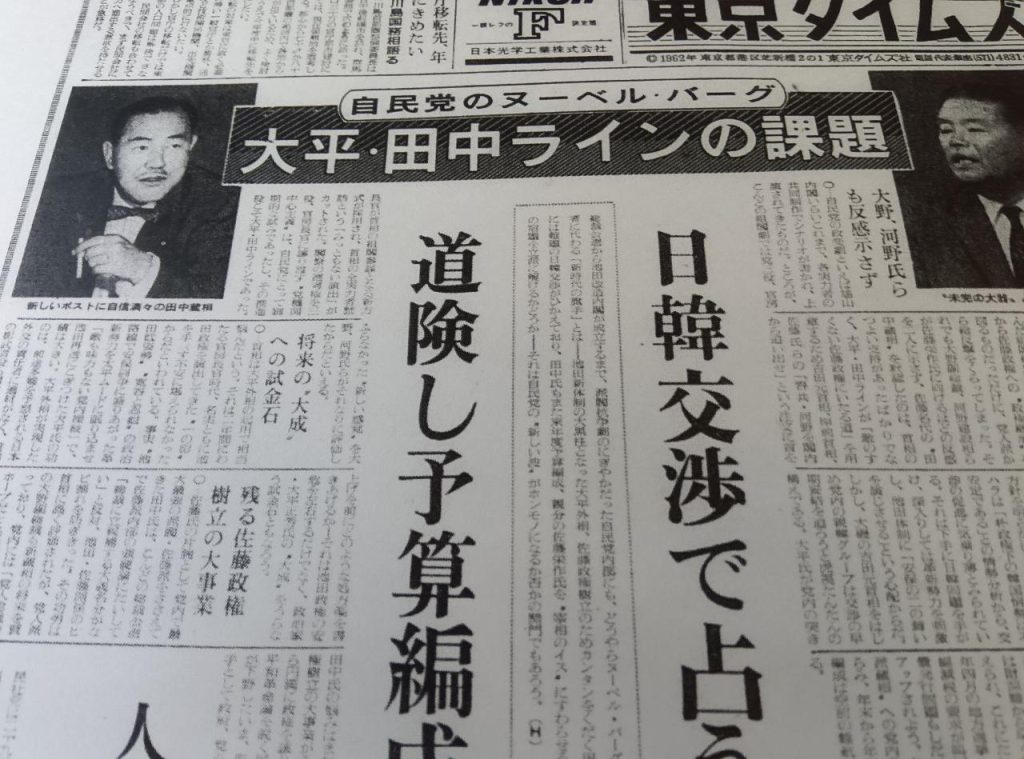 組閣後早坂は、これも約束通り、一面の半分を使って解説記事を書きます。題して「自民党のヌーベル・バーグ 大平・田中ラインの課題」。(H)の署名が入っています。それが、上記の写真の記事です。